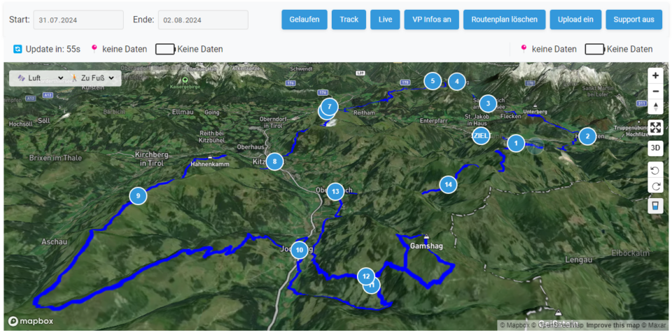 Die Steuerungen in der Karte sind selbstverständlich m, hier könnt ihr Zoomen, 3D Ansicht einschalten, Luftbild- oder Straßenkarte wählen, und über den Becher die Verpflegungspunkte ein-/ und ausblenden