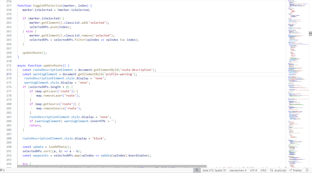 Die Funktion Routenplan löschen ist für die Supporter gedacht, es ist möglich einzelne VPs auszuwählen und eine Strecke zwischen den Orten sich planen zu lassen. Die Routenbeschreibung wird unter der Karte angezeigt. Die Auswahl Zu Fuß, Auto, Fahrrad beeinflusst hier das Routing.