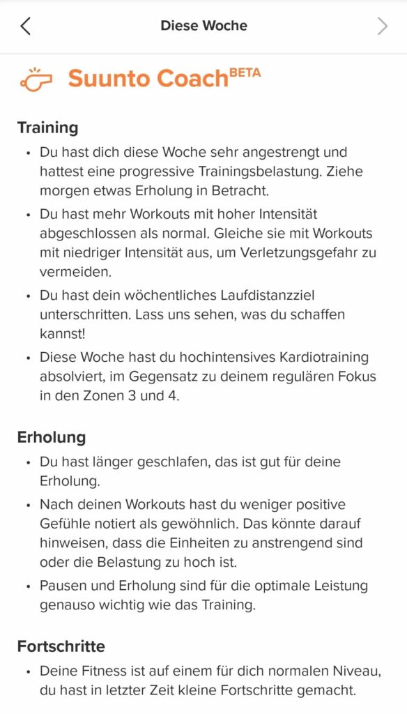 Es gibt viele zusätzliche Guides die viele Informationen zum optimalen Training liefern, noch mehr als bei meiner alten Peak 9. Der Suunto Coach gibt mir anhand von Listen und Vergleichen an, wie ich gerade im Training/Erholung und so stehe. Dies ist eine nette Sache, allerdings bin ich ja nicht so der Listenmensch. Trotzdem finde ich es ganz spannend und hilfreich 👍